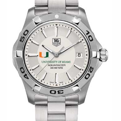Miami Mens TAG Heuer Steel Aquaracer watch with the U logo University of Miami is written underneath Brushed steel bracelet with a double security clasp Case stamped from a block solid steel 39mm diameter Unidirectional rotating bezel Luminescent hands and indexes for optimum readability Read More..