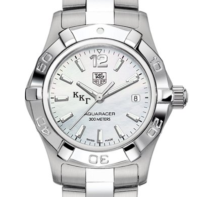 Kappa Kappa Gamma TAG Heuer womens Aquaracer watch with Kappa Kappa Gamma letters in black White mother of pearl dial with polished markers Brushed and Polished steel bracelet with double security clasp Case stamped from a solid block of stainless steel 27 mm diameter Unidirectional rotating Read More..